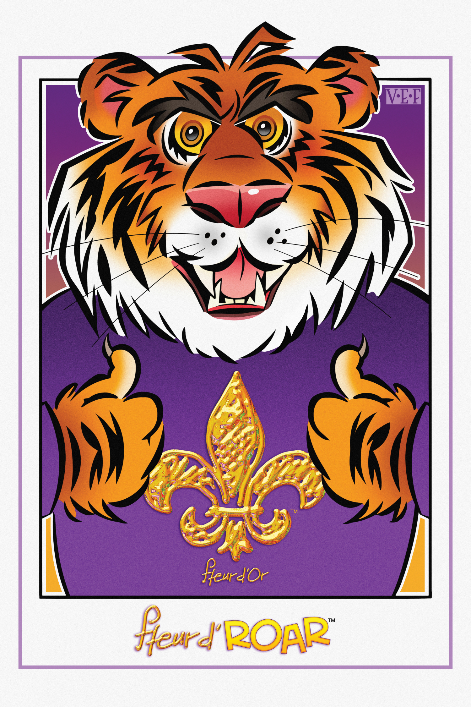Here is a tiger design for my Alma Mamma, Louisiana State University. I had a whole series of these on sale until the university made me take them down. It seems that the combination of purple + gold + tiger is their exclusive property—or such is their delusion. But they have better lawyers than I can afford, so I had to obey. Ah, well! At least I got noticed, which is something.