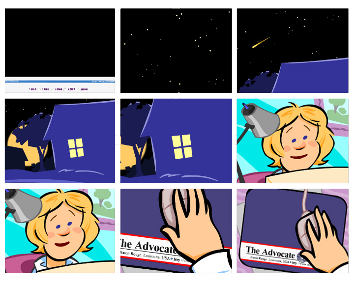 A long time ago, I decided to make an animated cartoon. I had no idea how to do it, so I learned as I worked. These are frames from the finished product, a 2 1/2 minute advertisement for The Baton Rouge Advocate newspaper. The soundtrack was Scott Joplin's Maple Leaf Rag. The animation is limited and crude, but I'm still rather stunned that I managed it at all.